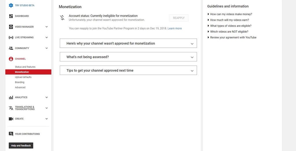 Thanks for the screenshot. You should've received an email with more info on why your channel wasn't approved. You can always reapply after 30 days i.e. on Dec 19, 2018. Also, please check the tips tab in the monetization page which can be of your help.