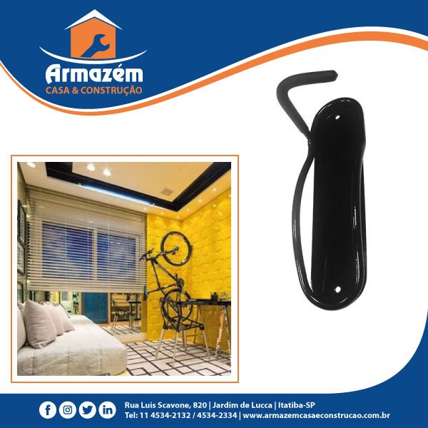 Com ótimo acabamento e cobertura emborrachada do gancho, que evita arranhões no aro da bicicleta, esse suporte de parede acomoda sua bike na vertical, ocupando menos espaço para guardá-la. Disponível em: http://goo.gl/ryNrBM