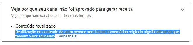 Desculpe Igor mas tenho de concordar com o Youtube. Você reposta vinhetas em cronologias reutilizando trechos de vídeos de outras pessoas. Sendo assim, você não pode ganhar dinheiro com esse conteúdo que nem dessas outras pessoas! Se fosse comigo, repostar tudo bem. Dinheiro não.