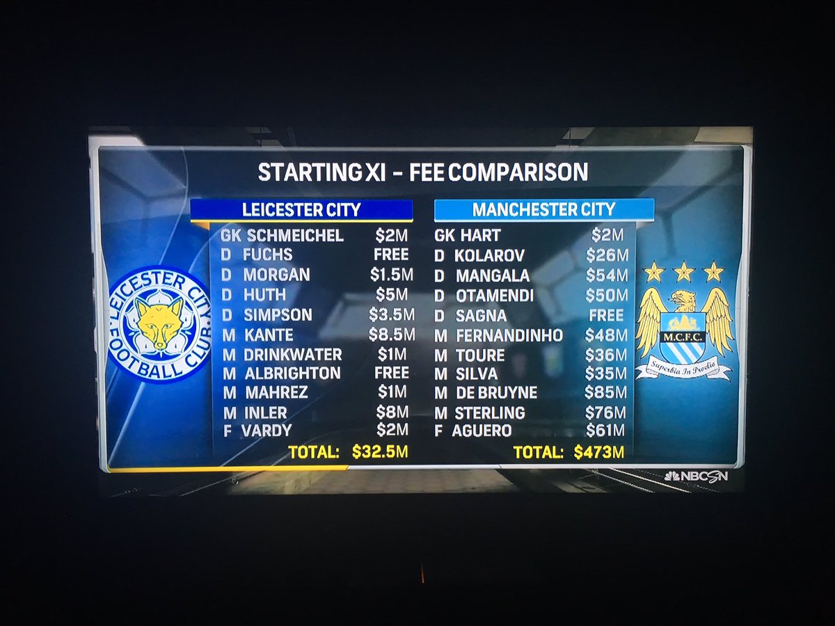 #Leicester vs#ManCity transfer fee comparison. $32.5m vs $473m when they played earlier this season#EPLpic.twitter.com/PFTrZBglli