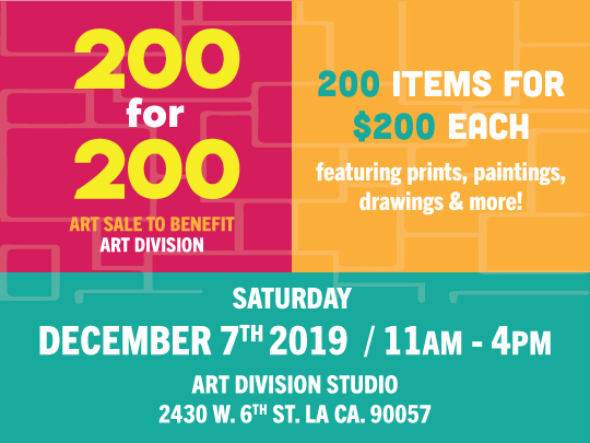 On December 7th Art Division will be hosting its annual 200 for 200 Fundraising Sale at the Art Division Studio (2430 W. 6th St. LA CA 90057) 200 pieces of art will be on sale for $200 each. Save the Date! Saturday Dec 7th, 11am - 4pm.