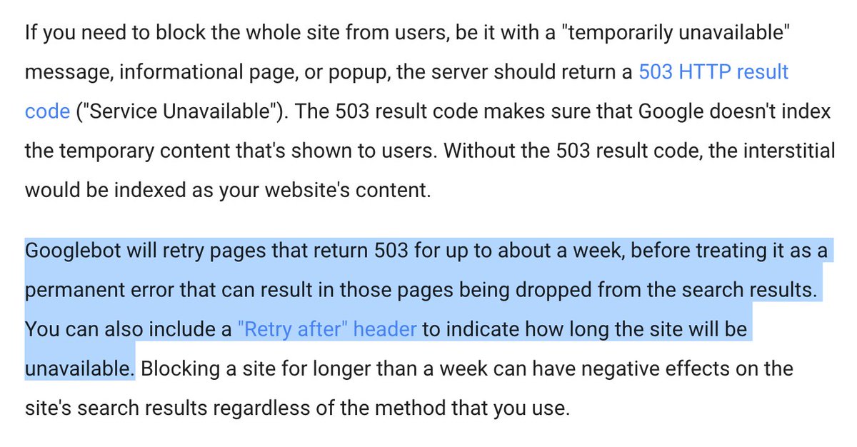 Tip: 503 response code tells Googlebot to avoid indexing temporary content: http://bit.ly/2lUduzp - also.. you can provide Retry-After!pic.twitter.com/4dfxjMdKQq