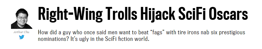 @voxday #sadpuppies Right-Wing Trolls Hijack SciFi Oscars http://thebea.st/1z7MiKK #chuspew
