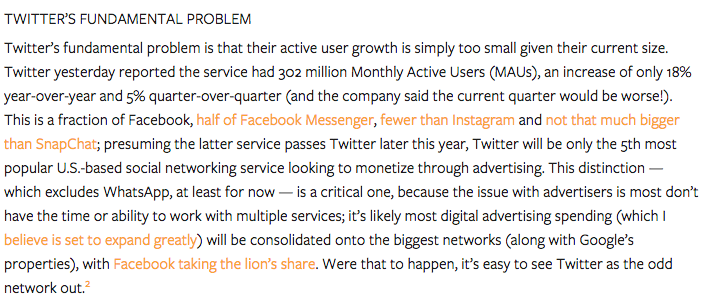 This is an evisceration of Twitter from @benthompson: http://stratechery.com/2015/twitter-needs-new-leadership/ … pic.twitter.com/9PzOIO6DuP