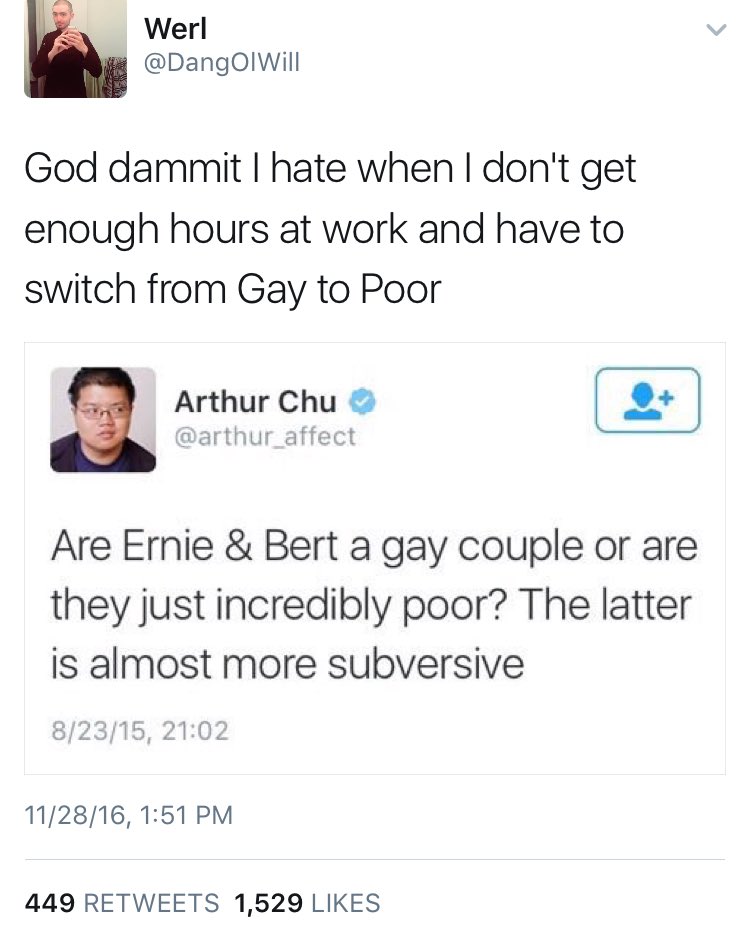 how dare you not have considerations about intersection of class/minority issues when jokin about felt men w detachable noses