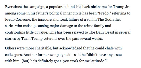 among some in Trump’s inner circle during the campaign, Don Jr. achieved the nickname “Fredo.” It has stuck: http://www.thedailybeast.com/trump-aides-russia-flap-proves-don-jr-is-the-fredo-of-the-first-family … pic.twitter.com/75V1x7WlT3