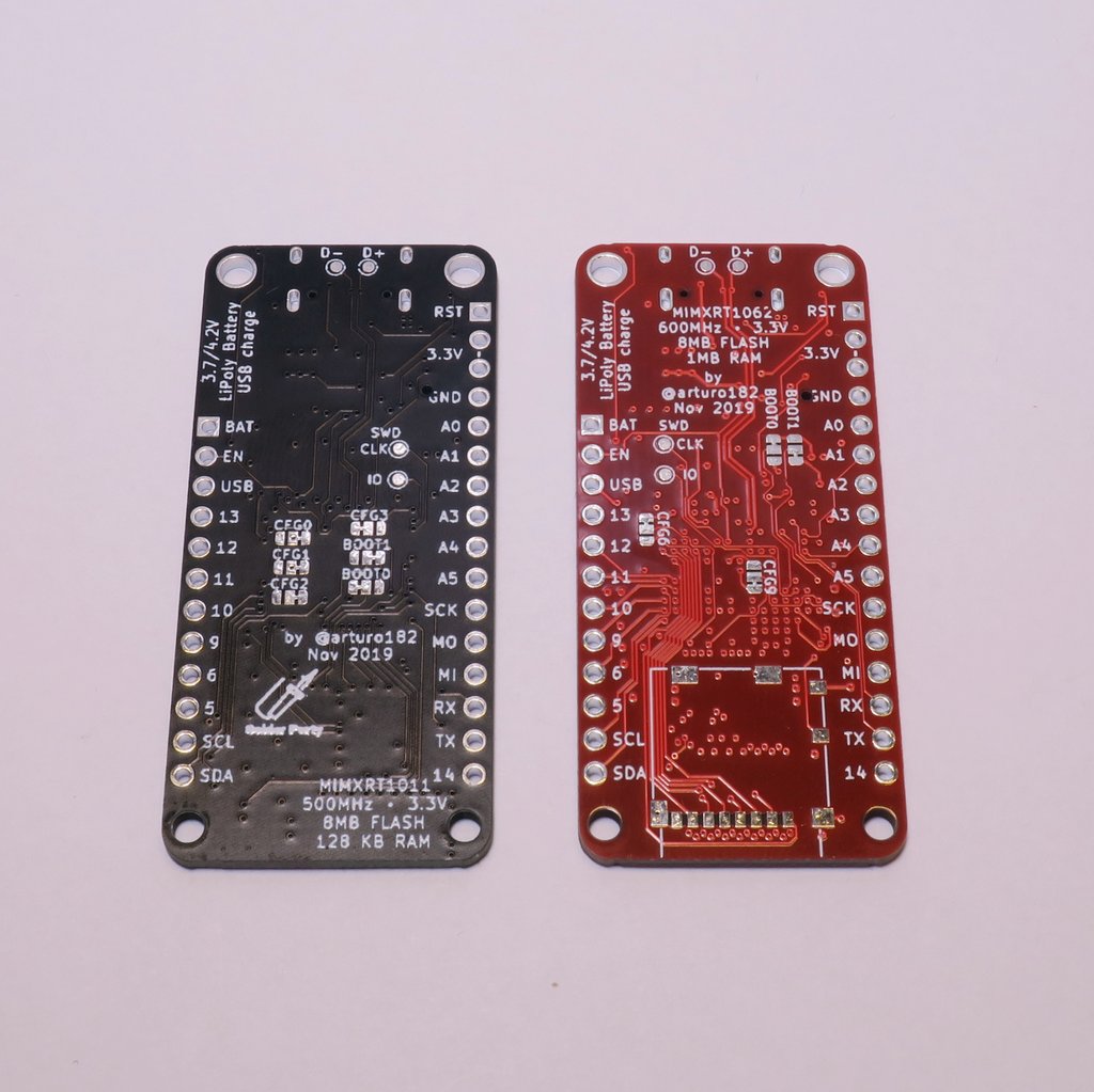 The official Fether is a bit different from the ones I'm working on, it has a microSD slot on the back and a Stemma QT connector on the front. My RT1011 doesn't have a card or the Stemma but has an ESP32. The RT1062 has a microSD and an LCD connector.https://twitter.com/arturo182/status/1199841134253682690 …
