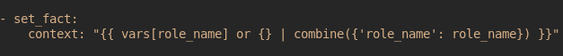 actually (yeah...) every line from above differs in behaviour (some don't work with filters), so here's the last version context: "{{ (lookup('vars', role_name) or {}) | combine({'role_name': role_name}) }}" enough ansible for today