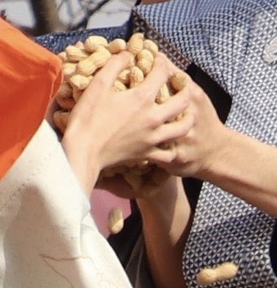 喜美ちゃんと八郎さんが並んで豆まきしてる~。