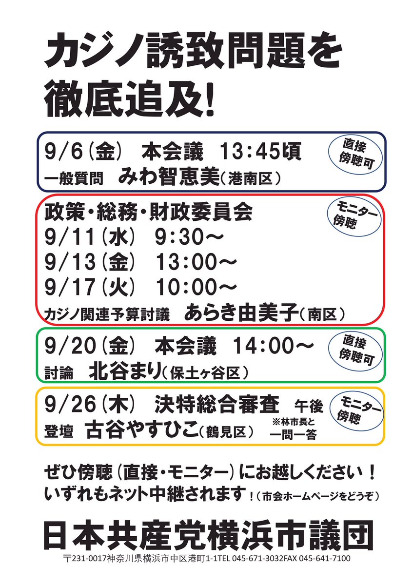 「こんな市長のやり方おかしい!」「カジノはいらない」という声を多くの方々とあげていきたいと思います。 〇横浜市議団長談話: http://www.jcp-yokohama.com/archives/21571 〇3日かわじ民夫市議の追及:http://www.jcp-yokohama.com/archives/21642 〇市議団の質疑予定:https://twitter.com/jcpyokohama/status/1169176101018427392?s=12 … 明日13:00~14:30、桜木町駅前宣伝します!