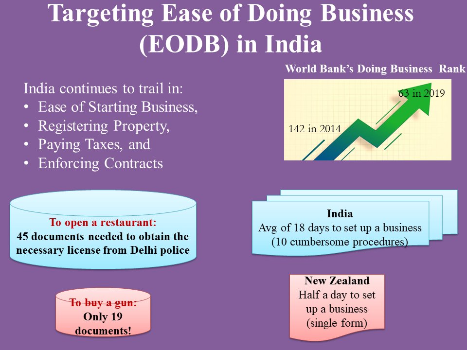 #EconomicSurvey 2019-20 : India has jumped up 79 positions in World Bank’s Doing Business rankings, improving from 142 in 2014 to 63 in 2019. It continues to trail in Ease of Starting Business (rank 136), Registering Property (rank 154) Enforcing Contracts (rank 163)pic.twitter.com/GFhzS15isD