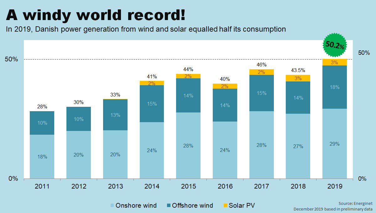 A new world record: for the first full year ever, more than 50% of Danish electricity comes from