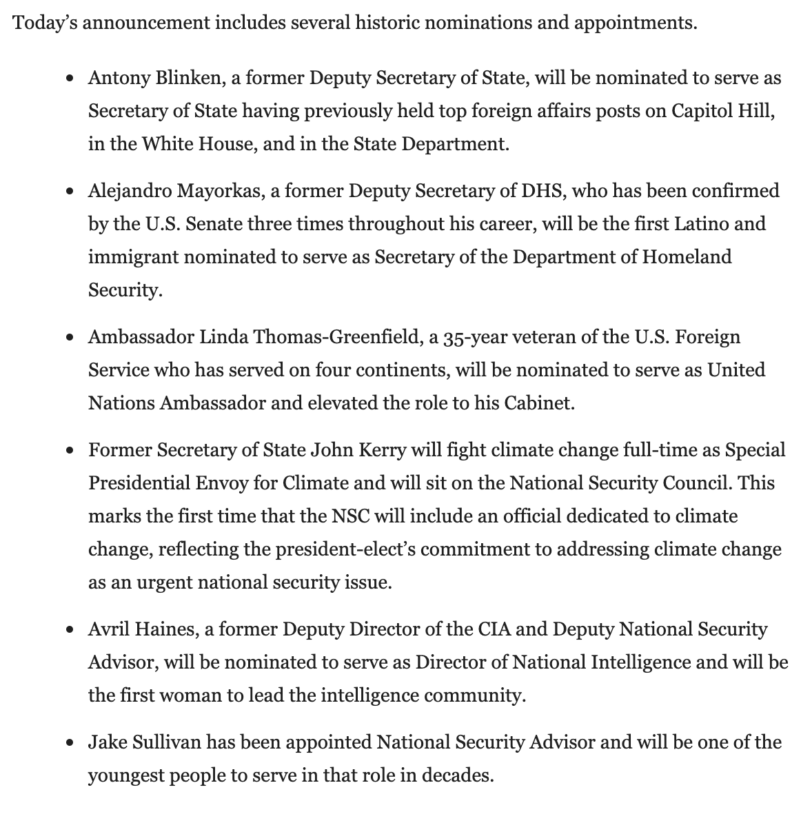 So far, Biden eschewing some of the flashier political celebrity names floated for top roles in favor of lower-profile longtime allies and policy hands.https://twitter.com/MariannaNBCNews/status/1330922940238606336 …