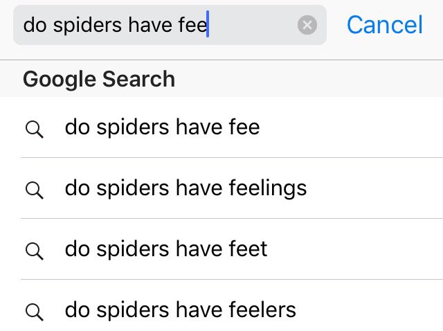 Went to google if spiders have feet or just little stumps and was amused at the suggestions.