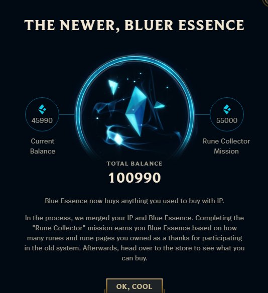 I got about 70,000 in total, then blew it all on Mystery Champions to get the rest of the champs I didn't own. Now I have like 680 left.