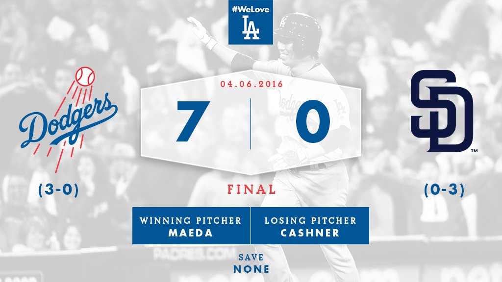 FINAL: #Dodgers 7, Padres 0 Three straight shutouts to begin the 2016 season.pic.twitter.com/Q3nGPW0IHR