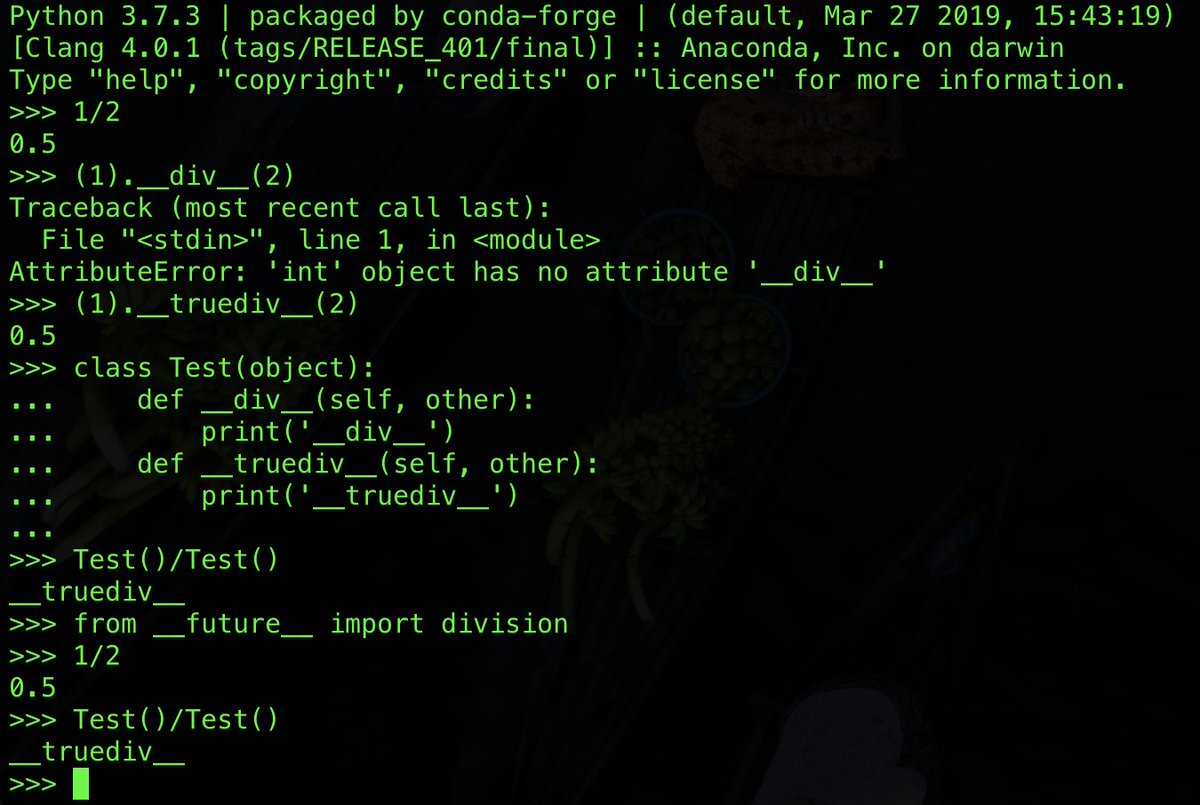 In Python 3 there is no more __div__. x/y always calls x.__truediv__(y). "from __future__ import division" is a no-op.pic.twitter.com/HdlKgalaWH