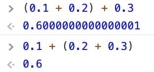 Reminder: addition of floating point numbers is NOT associative... (0.1 + 0.2) + 0.3 ≠ 0.1 + (0.2 + 0.3) ...and this is true in basically _any_ language that uses floating point numbers. Here it is in javascript in the browser console:pic.twitter.com/Lrl6JSMk39