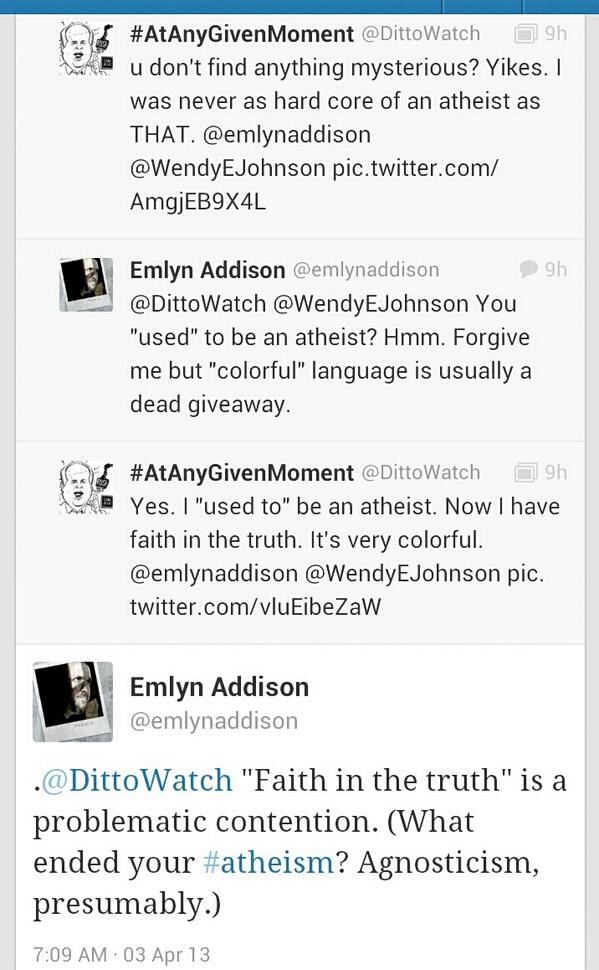 @DittoWatch "Faith in the truth" is a problematic contention. (What ended your#atheism? Agnosticism, presumably.) -