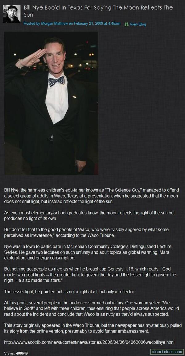 Bill Nye got booed for saying the moon only reflects light! Waco or should that read Wacko?pic.twitter.com/XKYcoNBp2g