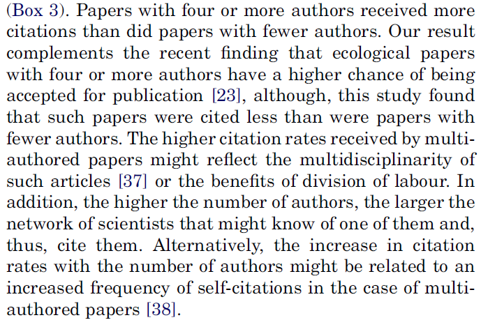 @aspicer@benchling papers with more coauthors are usually cited more often http://www.sciencedirect.com/science/article/pii/S016953470400312X …pic.twitter.com/r0qOk1TlV5