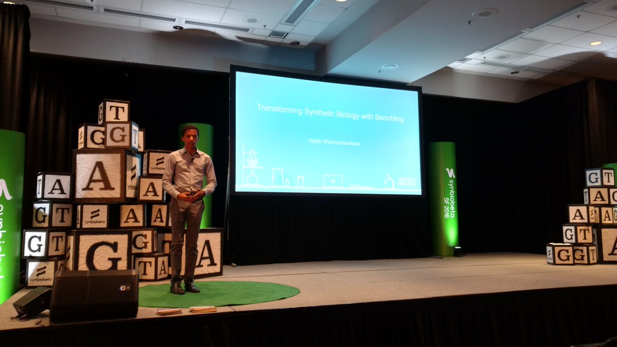 Saji from @benchling is up. Their software is used by 40k scientists all over the world!!!!! @SynBioBeta #SBBSF16pic.twitter.com/cMIBYpT8AU