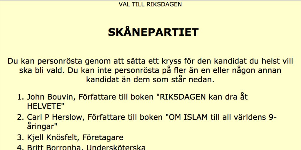 Alternativ för Sverige: Ingen har knäppare valsedel än oss Skånepartiet: Håll min spettekaka https://data.val.se/val/val2018/valsedlar/R/rvalkrets/12/valsedlar.html#id0054 …pic.twitter.com/5JdIHUBmfo