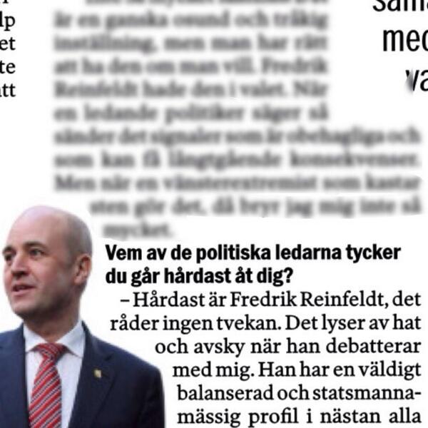 Jimmie Åkesson berättar i @Aftonbladet att Fredrik Reinfeldt är den partiledare som är hårdast mot honom. #svpolpic.twitter.com/frIPSbrEt6