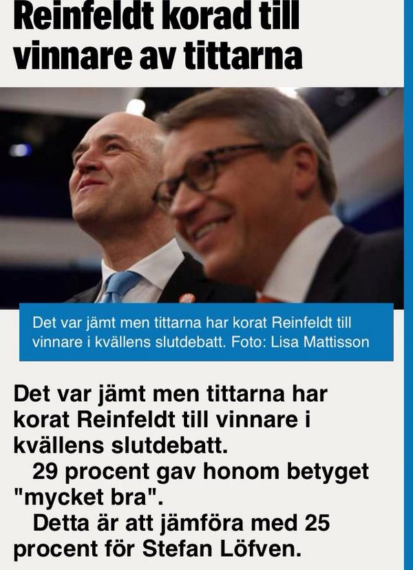 “@assarsson: Folket har talat: Fredrik Reinfeldt vann! #dinröst http://www.expressen.se/nyheter/val2014/reinfeldt-korad-till-vinnare-av-tittarna/ … pic.twitter.com/gyyZzkQsj2”