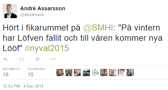 Älskar att SMHI RT:ade min tweet om #nyval2015. En myndighet som faktiskt har humor.pic.twitter.com/xIv198qrKU