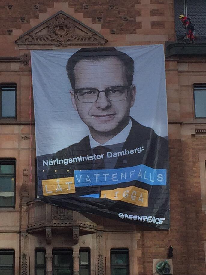 JUST NU: Banner på väg ner från @Naringsdep tak "Näringsminister @mikaeldamberg: Låt #Vattenfalls kol ligga!" #svpolpic.twitter.com/H5tJTrJZxG