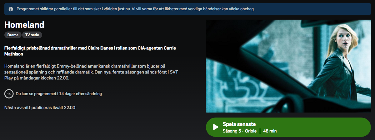 Ny disclaimer för Homeland på @svtplay. Nytt avsnitt släpps 22.00 ikväll.pic.twitter.com/CGeLdDYY1g