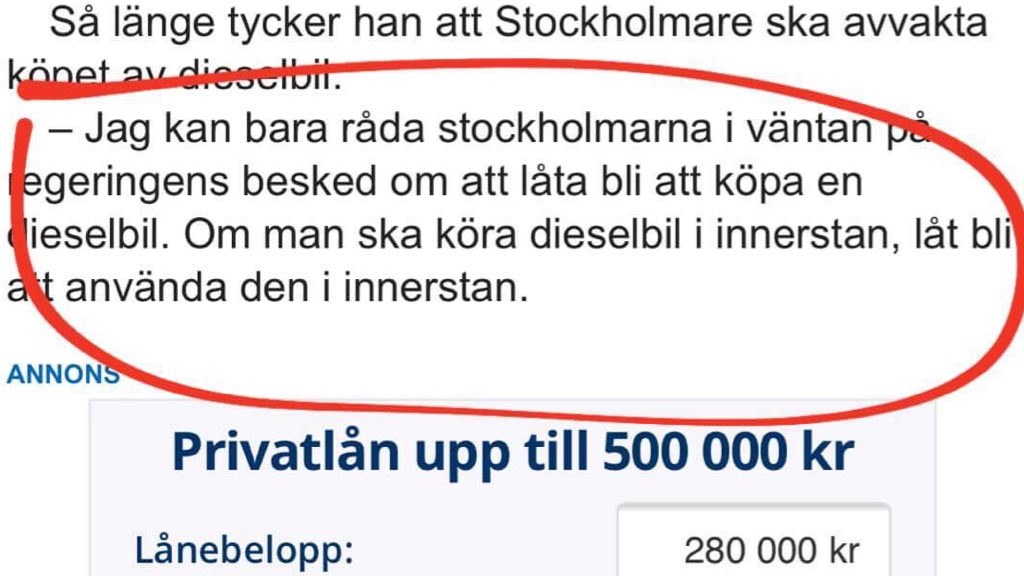 Bra placering av reklam för lån.. Vår ena bil får inte köra in i Stockholm city isf.