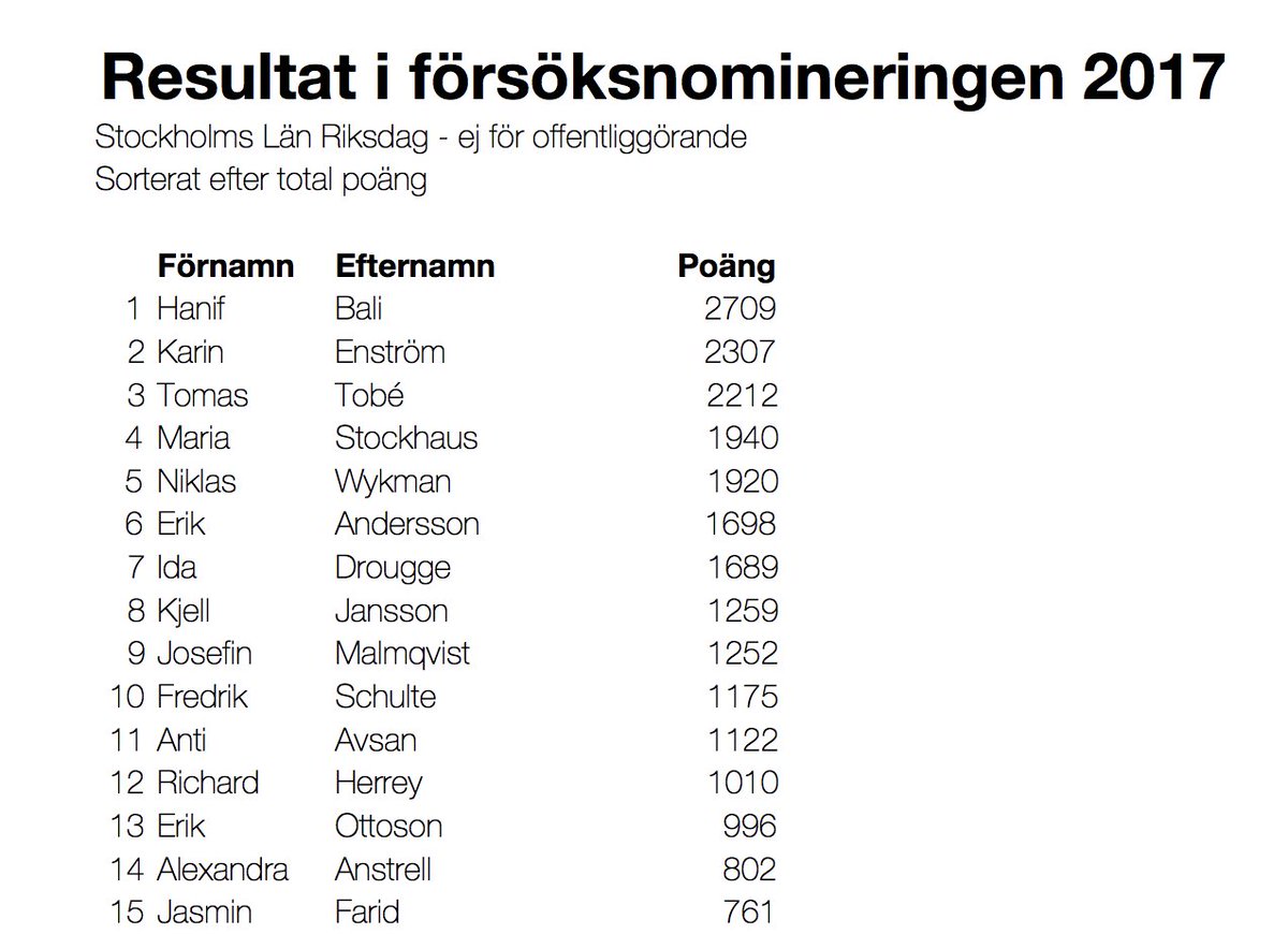 Här är topp 15-placeringarna från @nya_moderaterna till riksdagen i Stockholms län. Försöksnomineringar internt.
