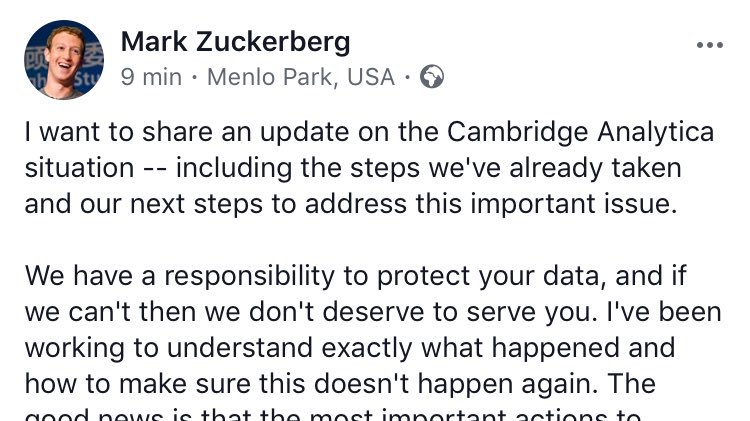 Just nu: Facebooks grundare krishanterar på Facebook om Facebook https://www.facebook.com/zuck/posts/10104712037900071 …pic.twitter.com/sBUxXU2I3x
