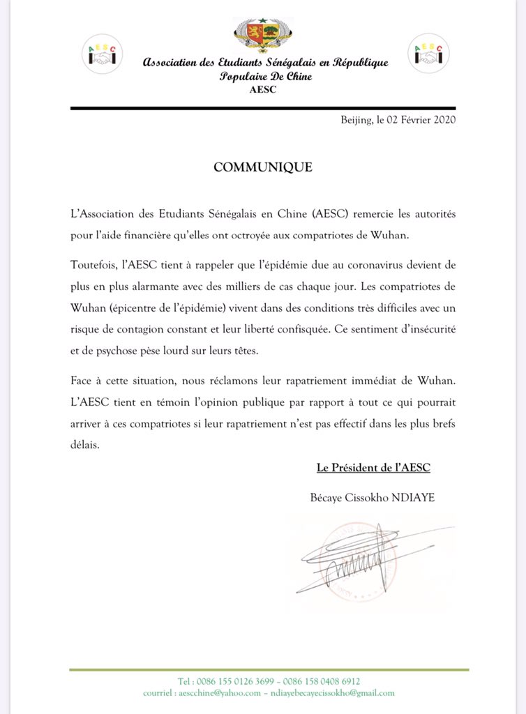 Communiqué de l’Association des Étudiants Sénégalais en Chine concernant nos compatriotes à Wuhan