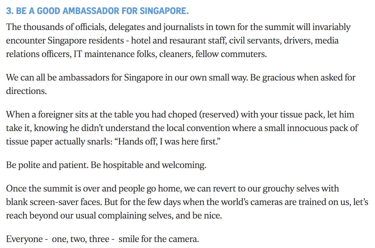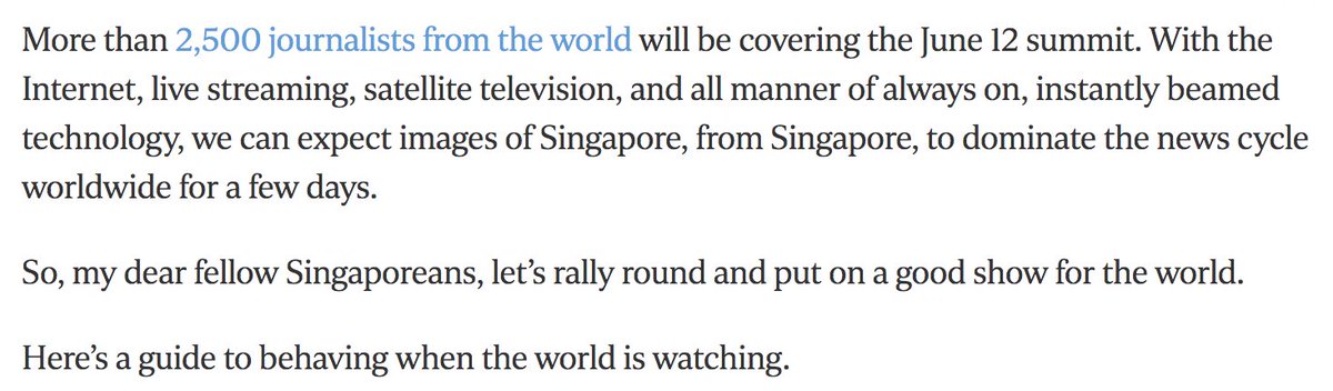 With the #TrumpKimSummit almost upon us, @STcom drops some patronising bullshit on Singaporeans, as if we’re all happy zoo animals. https://www.straitstimes.com/opinion/one-two-three-smile-singapore-for-the-worlds-cameras … pic.twitter.com/ooWVPl993O