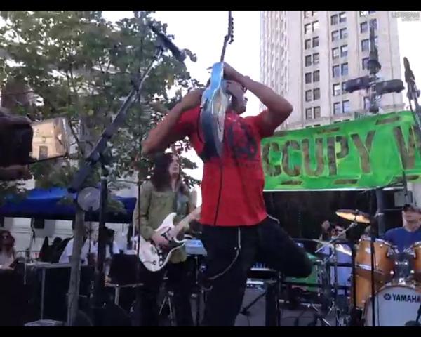 Tom Morello rocking it on the bandstage at Foley Sq. "My guitar is out of tune, make it the loudest 15"" #s16 #owspic.twitter.com/S6hAuvWA