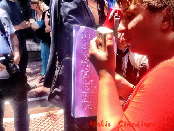 Great photo TR @MakisSinodinos Blind protesters reading Braille slogans to be heard at PM office #Greecepic.twitter.com/tNZfe5kytl