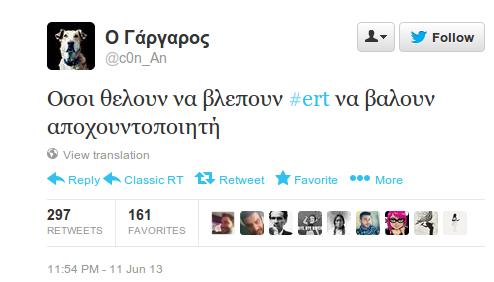 Η ατάκα της βραδιάς χθες - RT @c0n_An "Οσοι θελουν να βλεπουν #ert να βαλουν αποχουντοποιητή" https://twitter.com/c0n_An/status/344558257035169792 …pic.twitter.com/Bovw2h2lIs