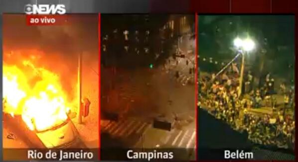 Screenshot: Teargas in Campinas (red), burning car in Rio (yellow), clashes in Belem (green) #Brazilpic.twitter.com/7xLVemyWXp