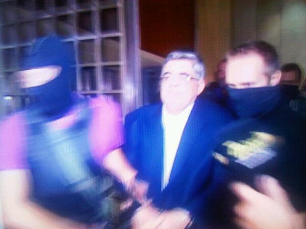 Didn't want cuffs. "Big smile!" MT @indesax The leader of #GoldenDawn being transfered to the DA's officepic.twitter.com/qndOHj8ZXZ