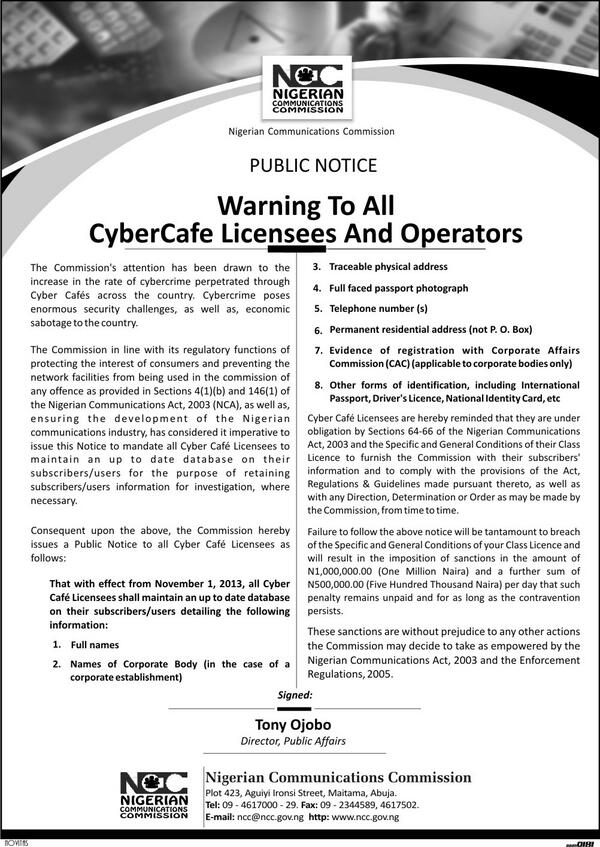 Nigeria RT @gbengasesan While world discusses at #IGF2013 RT @NgComCommission WARNING TO ALL CYBER CAFE LICENSEESpic.twitter.com/k5G4NLhsCK