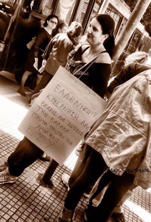 Laid off employee placard to the Greek govt "in order to save Greece, you first have to get fired" RT @MakisSinodinospic.twitter.com/ftQR5pvRRg