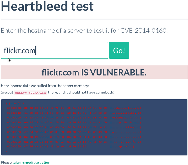 Hey, @flickr, you're vulnerable to #Heartbleed, check your #OpenSSL!pic.twitter.com/f7Cdci6tOa
