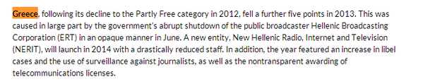Too little RT @damomac What the #FOTP2014 says about #pressfreedom in #Greece http://freedomhouse.org/report/freedom-press-2014/overview-essay#.U2JUkPmSzp1 …pic.twitter.com/fjhw49Ftdb