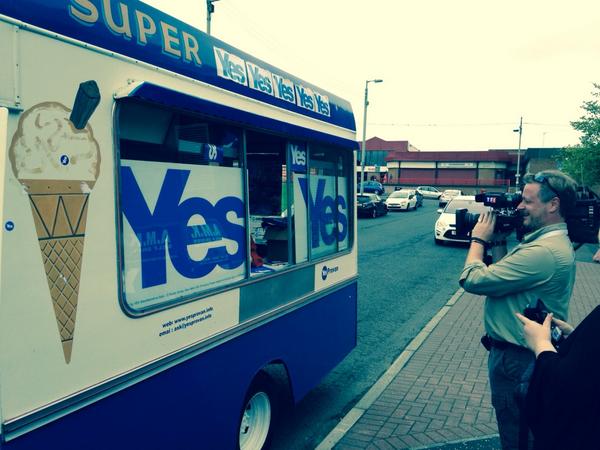 Yes We Cone :) RT @ewenmacaskill Converted ice cream van used by Yes campaign in Glasgow's East End.pic.twitter.com/TiZX6emjbh