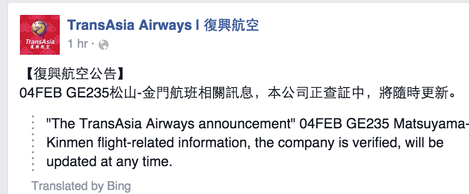 Still the last, 4 hrs ago RT @kimbui The last FB post from @TransAsiaAirway. #GE235pic.twitter.com/8QlR8LDGKB
