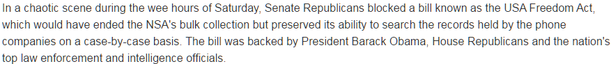 Surveillance in the time of Obama. (Failed) "Freedom Act" = data retention w expanded immunity http://america.aljazeera.com/articles/2015/5/23/usa-freedom-act-an-explainer.html …pic.twitter.com/XtwbIRvAhp