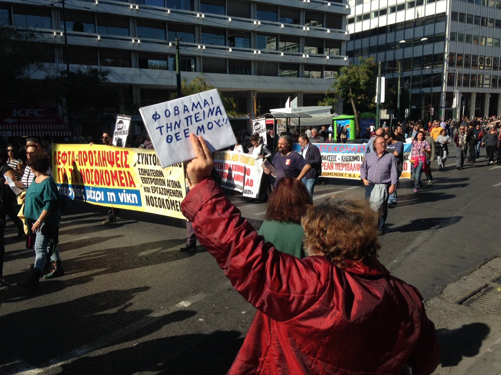 An evergreen Greek indignant protest placard at the general strike rally in Athens: "I'm afraid of hunger, my God"https://twitter.com/dionisisath/status/664752742787915776 …